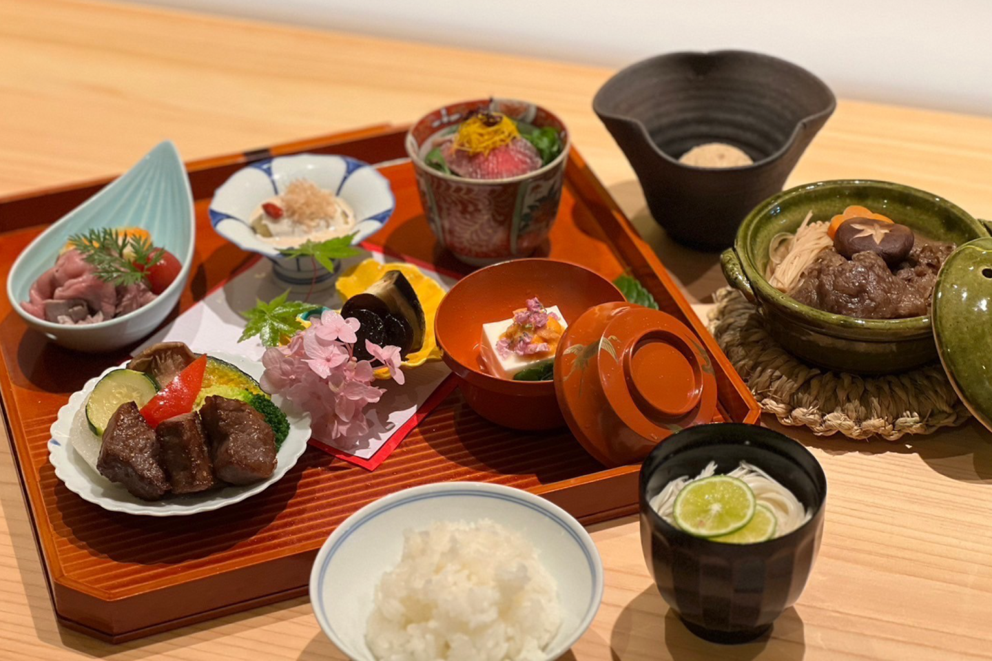 すき焼き・しゃぶしゃぶ・ミニステーキ・ローストビーフをお楽しみ頂けます。御膳に収まりきらない美味しさとボリューム。ぜひご賞味くださいませ。