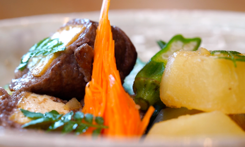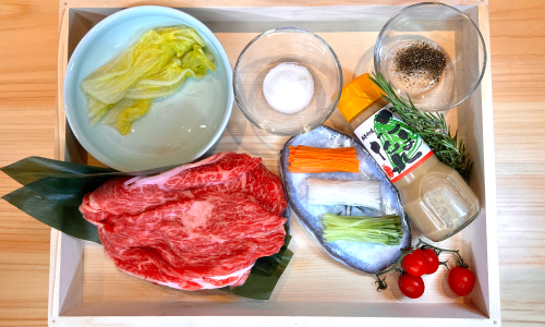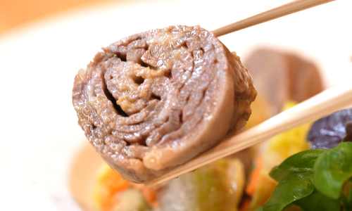 牛モモしゃぶしゃぶ肉のボリュームアップ料理をご紹介します。食べ応えがあり、しかもとってもヘルシーな一品です。ぐつぐつ煮てしまいそうな根菜類ですが、プロの技で素材そのものの味が楽しめますよ!
